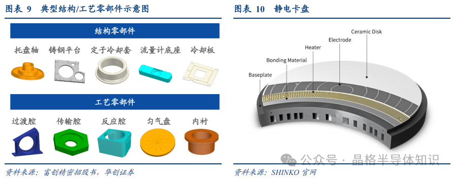 金屬工藝件:在設(shè)備中與晶圓直接接觸或直接參與晶圓反應(yīng)。以勻氣盤為例,在薄膜沉積及刻蝕過程中,特種工藝氣體通過勻氣盤上的小孔后均勻沉積在晶圓表面,以確保膜層的均勻性,其加工與表面處理為技術(shù)難點(diǎn)。金屬工藝件一般需要經(jīng)過高精密機(jī)械制造和復(fù)雜的表面處理特種工藝過程,具備高精密、高潔凈、超強(qiáng)耐腐蝕、耐擊穿電壓等特點(diǎn),工藝制程復(fù)雜。 金屬結(jié)構(gòu)件:結(jié)構(gòu)件一般起連接、支撐和冷卻等作用,對平面度和平行度有較高的要求,部分結(jié)構(gòu)零部件同樣需要具備高潔凈、強(qiáng)耐腐蝕能力和耐擊穿電壓等性能。代表產(chǎn)品包括托盤、鑄鋼平臺、流量計(jì)底座、冷卻板等,不同產(chǎn)品差異較大,難點(diǎn)包括不銹鋼的高精密加工、超高光潔度制造、表面處理等技術(shù)。 非金屬機(jī)械件:包括石英制品、陶瓷產(chǎn)品等,技術(shù)門檻極高。以靜電卡盤(E-Chuck)為例,它是在晶圓制造過程中為防止晶圓變形,利用靜電吸附原理對超薄晶圓片進(jìn)行平整均勻夾持的零部件,被廣泛用于刻蝕、沉積、離子注入等設(shè)備中。目前現(xiàn)有的靜電卡盤以氧化鋁陶瓷或氮化鋁陶瓷作為主體材料,并且進(jìn)行分區(qū)溫度控制,層次較多結(jié)構(gòu)復(fù)雜,通常采用陶瓷與電極高溫共燒而成,技術(shù)難度高。